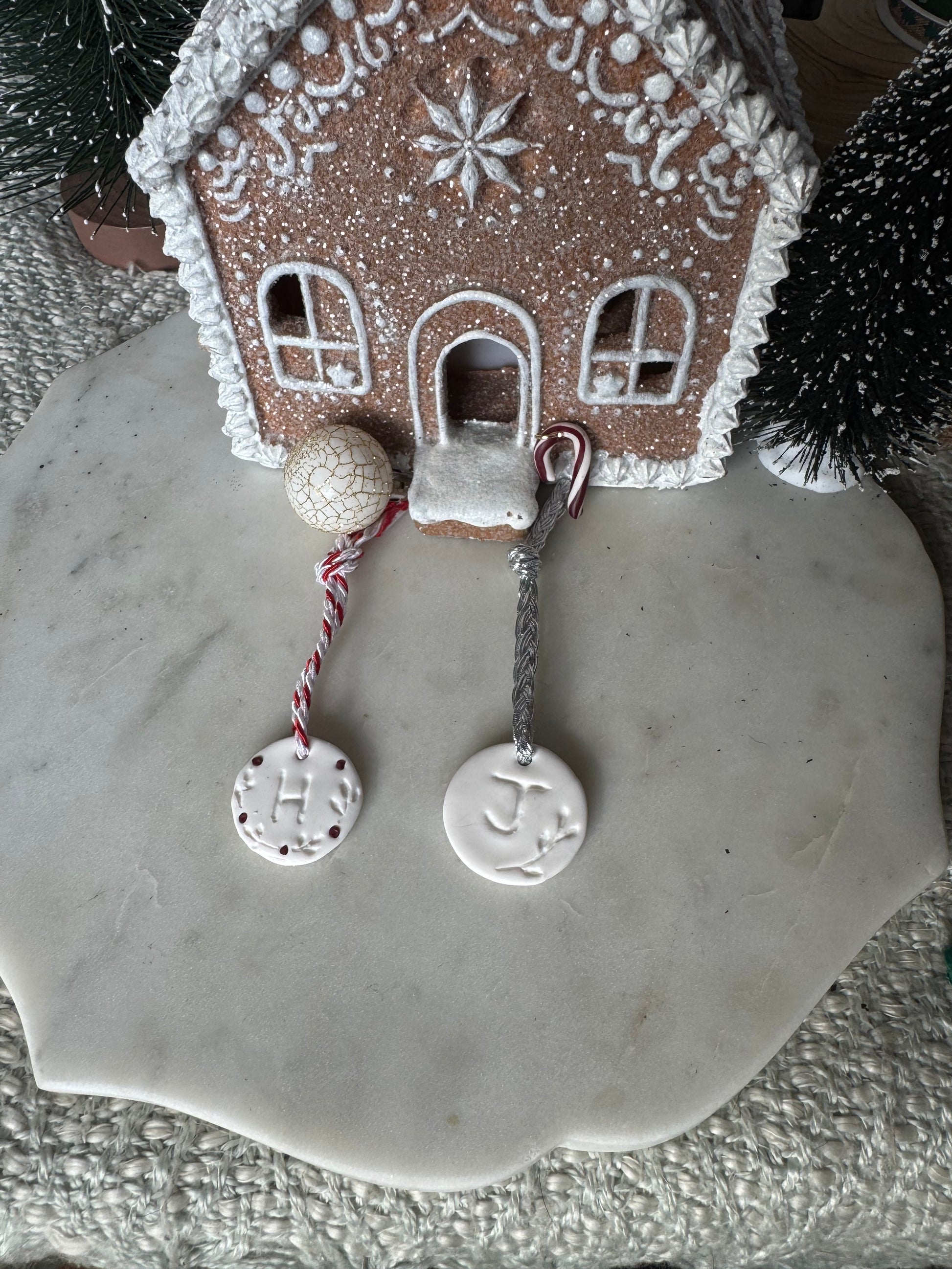 Simple white tags stamped with an initial.